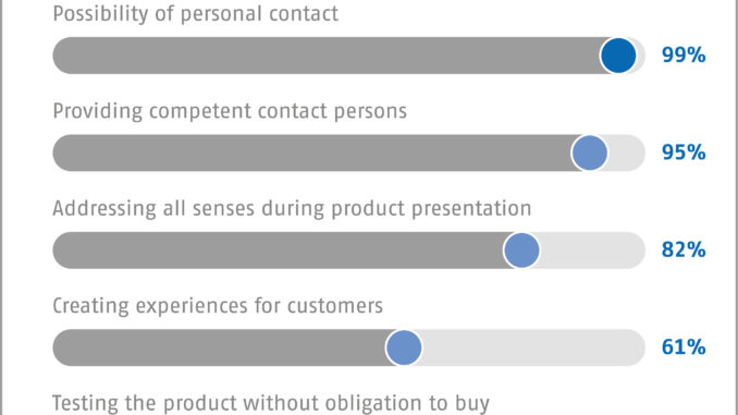 Eighty-two per cent of companies surveyed see the ability to address all five senses in authentic product presentations to be a significant advantage of exhibitions over digital formats. Closely related to that is the finding that nearly 50% of exhibitors consider it important that products can be tested at trade fairs with no obligation to purchase them. And 60% see a sustainable positive effect for their companies if they can create experiences for trade visitors.