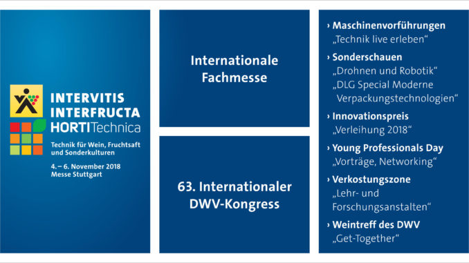 The preparations for INTERVITIS INTERFRUCTA HORTITECHNICA, which will be held in Stuttgart from 4 to 6 November 2018, are well underway. The focal point of the technology trade fair for wine, fruit juice and special crops and the concurrent 63rd International DVW Congress will be digitalisation in all its facets. First-class delegates from home and abroad are expected to attend the Congress. The machine demonstrations, traditional highlights of the trade fair, will also fully reflect the digital future. This also applies to the special show “Drones and robotics” in the new Paul Horn Hall (Hall 10).